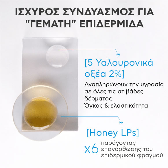 Ανακαλύψτε τον ισχυρό συνδυασμό 5 τύπων Υαλουρονικού Οξέος και Μελιού για άμεσα λεία και “γεμάτη” επιδερμίδα.