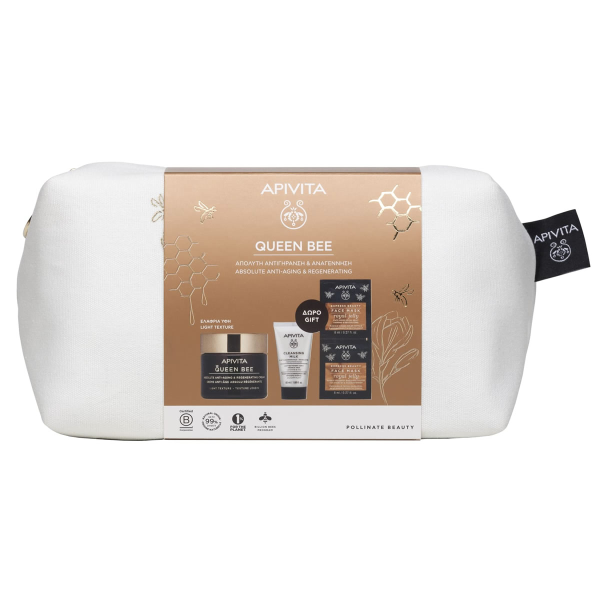 Απόλυτη Αντιγήρανση & Αναγέννηση: APIVITA QUEEN BEE Κρέμα Απόλυτης Αντιγήρανσης & Αναγέννησης Ελαφριάς Υφής 50ml + ΔΩΡΟ Γαλάκτωμα καθαρισμού 3 σε 1 50ml για Πρόσωπο & Μάτια σε ειδικό μέγεθος + ΔΩΡΟ Μάσκα Προσώπου Βασιλικός Πολτός 2x8ml.