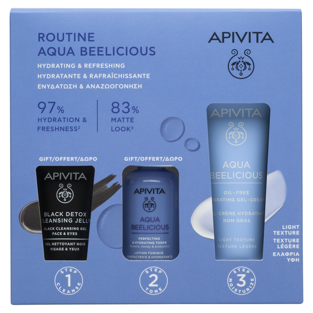 APIVITA Proμο Routine Aqua Beelicious : Aqua Beelicious Κρεμα-Gel Ελαφριάς Υφής Με Δώρο Μίνι Λοσιόν Ενυδάτωσης Κατά των Ατελειών & Mini Μαύρο Gel Καθαρισμού Προσώπου & Ματιών