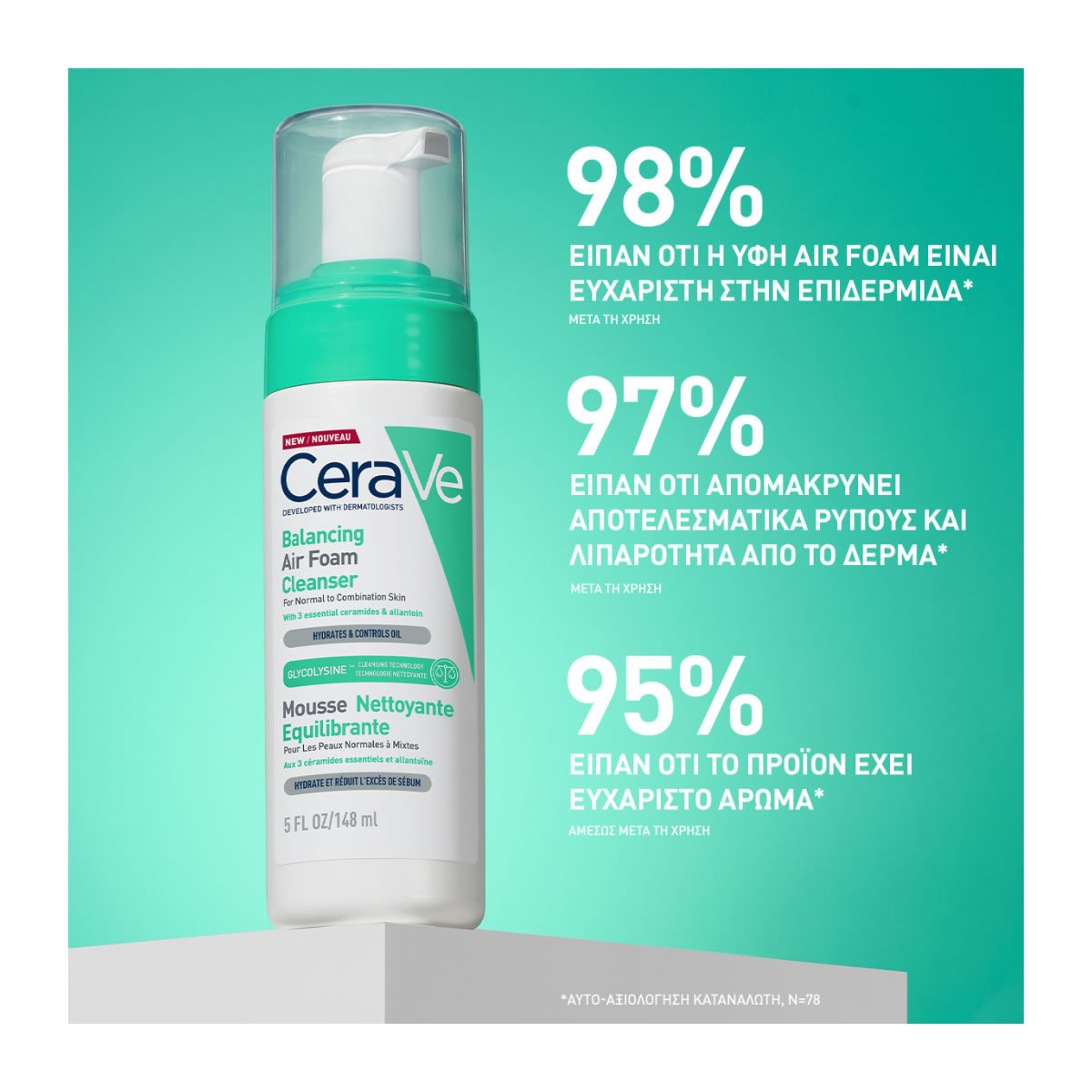 Το CeraVe Balancing Air Foam Cleanser είναι ένα καθαριστικό προσώπου για Κανονικό έως Μικτό δέρμα. Ενυδατώνει και ταυτόχρονα ρυθμίζει την λιπαρότητα. Με την ΝΕΑ καινοτόμο τεχνολογία GLYCOLYSINE™, μειώνει την υπερ-παραγωγή σμήγματος στις περιοχές που το δέρμα είναι λιπαρό και ενυδατώνει στις περιοχές που είναι ξηρό. Προσφέρει 8 ώρες έλεγχο της λιπαρότητας και 24 ώρες ενυδάτωση, για έναν υγιή επιδερμιδικό φραγμό. Είναι ιδανικό για το ευαίσθητο δέρμα, απομακρύνει αποτελεσματικά τους ρύπους καθώς και υπολείμματα make up & αντηλιακού. Μειώνει την ερυθρότητα. Χωρίς άρωμα, Φυσιολογικό pH, Δεν προκαλεί ατέλειες, Υποαλλεργικό.