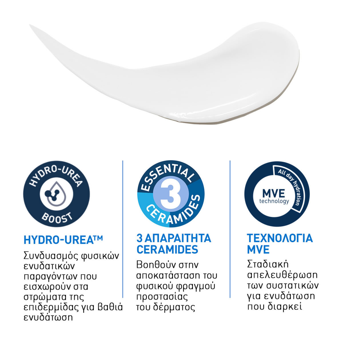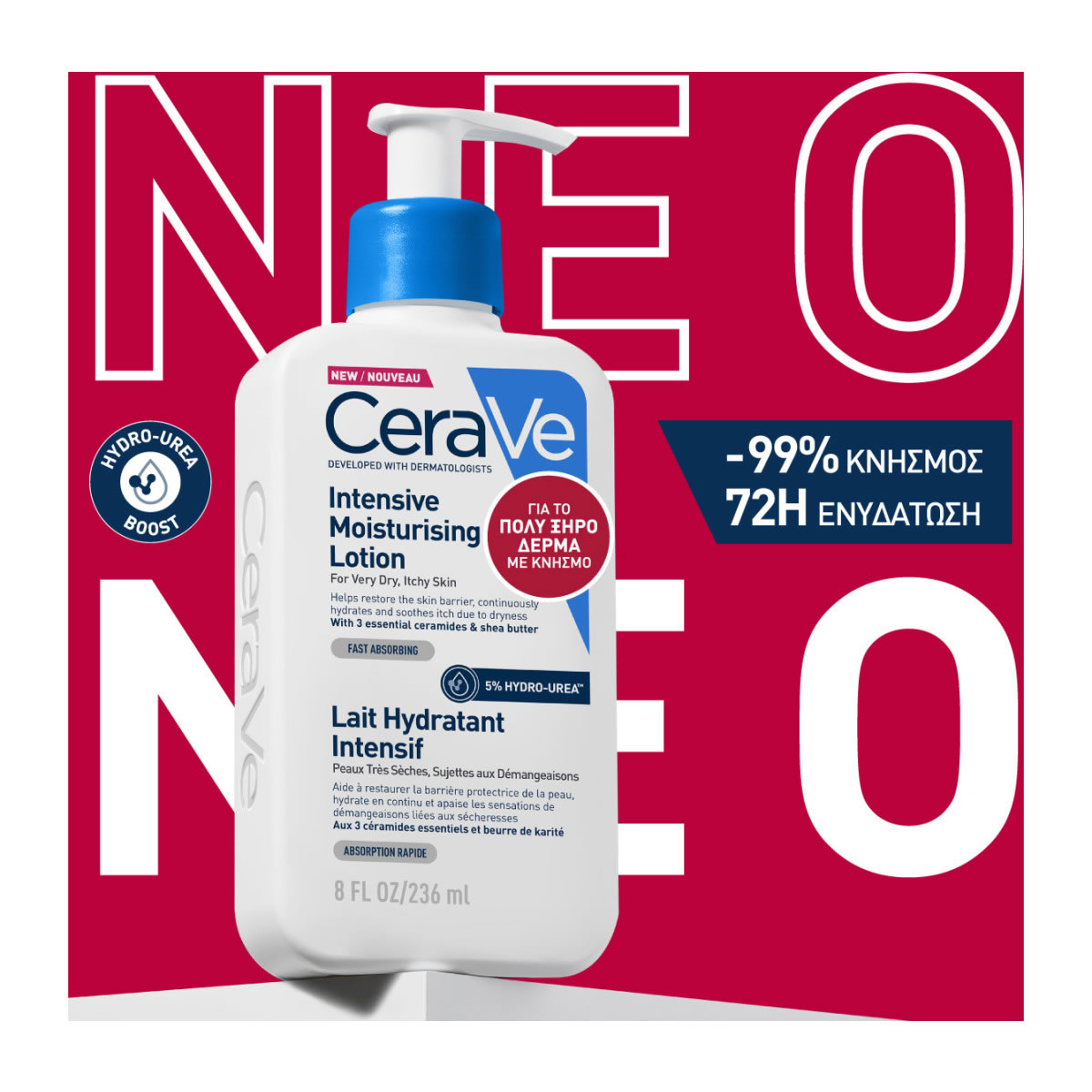 Η Intensive Moisturising Lotion της Cerave είναι μία ενυδατική λοσιόν που βοηθά στην αποκατάσταση του επιδερμιδικού φραγμού, προσφέρει διαρκή ενυδάτωση και καταπραΰνει την επιδερμίδα με κνησμό που οφείλεται στην ξηρότητα. Με 3 απαραίτητα ceramides, τεχνολογία διάχυσης MVE και βούτυρο καριτέ. Περιέχει 5% HYDRO-UREA. Αυτή η ενυδατική λοσιόν γρήγορης απορρόφησης, ανακουφίζει και προστατεύει από τα 5 βασικά σημάδια ξηρότητας – κνησμό, αίσθηση τραβήγματος, τραχύτητα, ξεφλούδισμα και ερυθρότητα. Προσφέρει 72 ώρες ενυδάτωση μετά από 1 μόνο εφαρμογή και μειώνει τον κνησμό κατά 99% μετά από 1 εβδομάδα. Ιδανική για την πολύ ξηρή ώριμη επιδερμίδα.