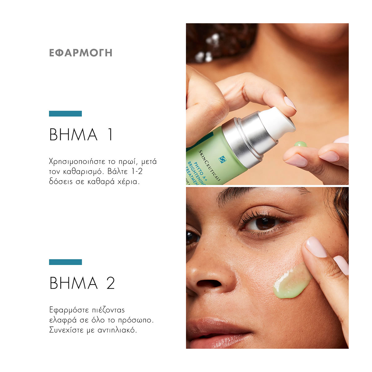 Εφαρμόστε δύο φορές την ημέρα, 1-2 πιέσεις μετά τον καθαρισμό. Το πρωί, εφαρμόστε μετά από έναν αντιοξειδωτικό ορό SkinCeuticals και συνεχίστε με αντηλιακό.