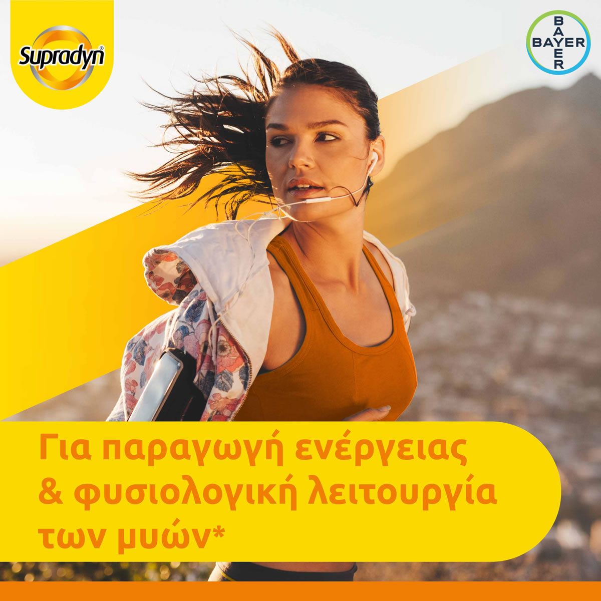 Το Supradyn Active περιέχει Μαγνήσιο, Κάλιο & 5 ακόμη Βιταμίνες, τα οποία συμβάλλουν στην παραγωγή ενέργειας, στην ισορροπία των ηλεκτρολύτων, που είναι ιδιαίτερα σημαντική σε περιόδους με υψηλή θερμοκρασία, στη μείωση της κούρασης και της κόπωσης, στη φυσιολογική λειτουργία των μυών*