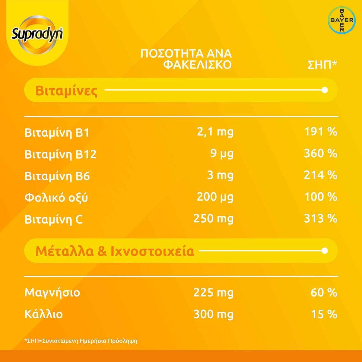*Οι βιταμίνες Β1, Β6, Β12, C και το μαγνήσιο συμβάλλουν στη φυσιολογική λειτουργία των μεταβολικών διεργασιών που αποσκοπούν στην παραγωγή ενέργειας. Οι βιταμίνες Β6, Β9, Β12, C και το μαγνήσιο συμβάλλουν στη μείωση της κούρασης και της κόπωσης. Το μαγνήσιο συμβάλλει στην ισορροπία των ηλεκτρολυτών και στη φυσιολογική λειτουργία των μυών.