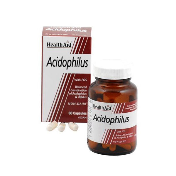 Tο Acidophilus της HealthAid βοηθά στη διατήρηση της ισορροπίας της εντερικής χλωρίδας, όταν διαταράσσεται από κάποιες αιτίες: τροφές, αντιβιοτικά, διάρροια, λήψη αντισυλληπτικών, στρες, σύνδρομο ευερέθιστου εντέρου ή και λοίμωξη από κάντιντα. Το Αcidophilus αυξάνει τον αριθμό των φιλικών βακτηριδίων που ανταγωνίζονται τα παθογενή, δημιουργώντας μια υγιή χλωρίδα, η οποία βοηθά στην πέψη και κατ΄ επέκταση στη γενική καλή υγεία του οργανισμού και στη σωστή λειτουργία του εντέρου. Με φρουκτοολιγοσακχαρίτες (Πρεβιοτικά FOS) για μεγαλύτερη διάρκεια ζωής.