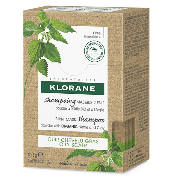 Το σμηγματορρυθμιστικό σαμπουάν μάσκα 2 σε 1 με εκχύλισμα βιολογικής Τσουκνίδας της KLORANE. Βιοδιασπώμενη σύνθεση, λιγότερο πλαστικό: