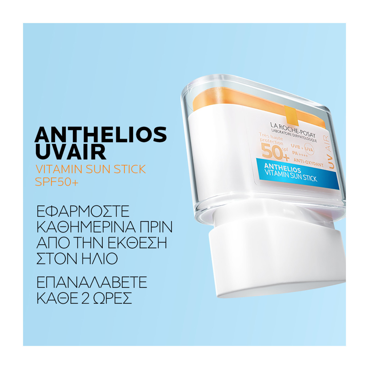 Το Anthelios UVAIR Vitamin Sun Stick SPF 50+ της La Roche- Posay είναι ένα αντηλιακό στικ προσώπου με πολύ υψηλή προστασία