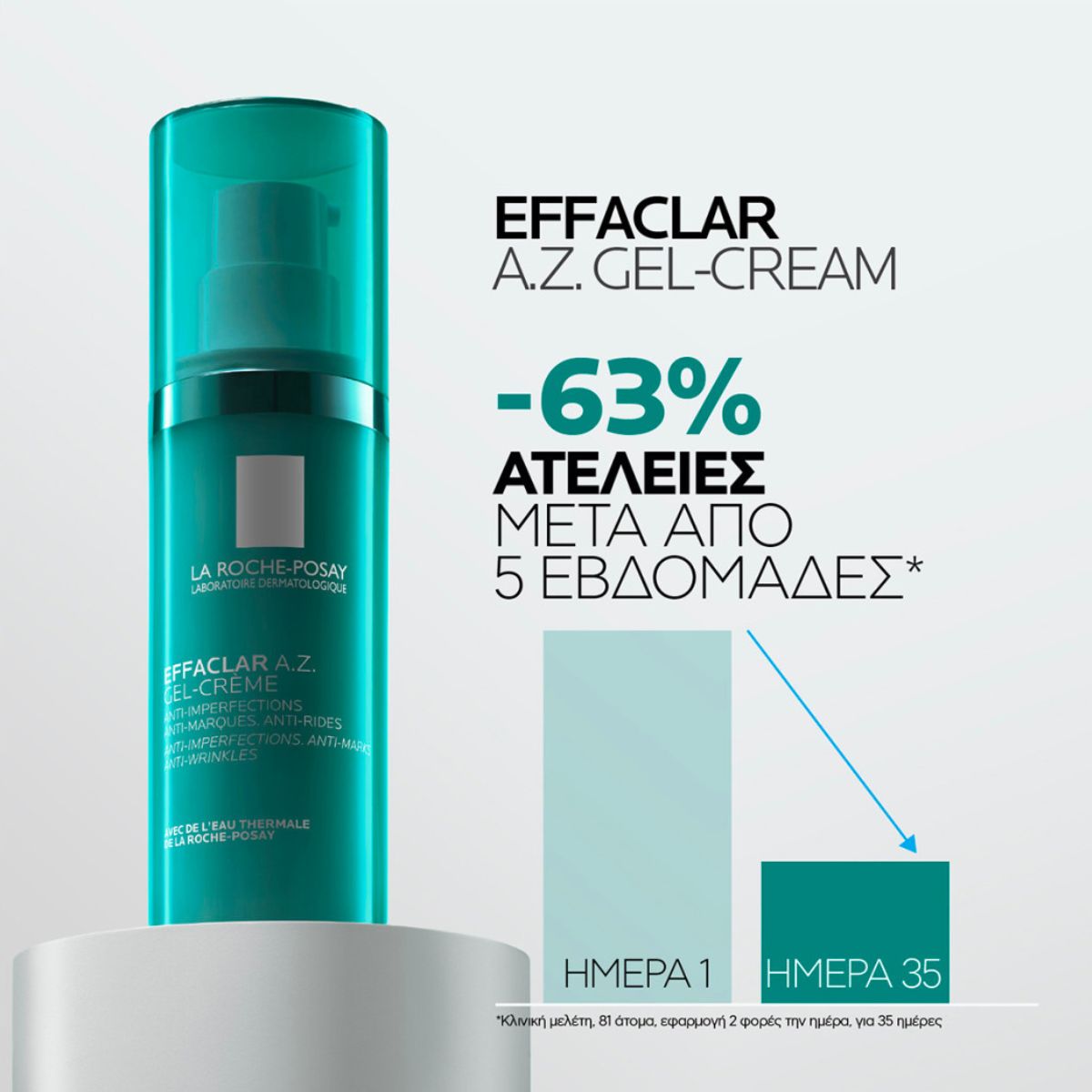 Nέο Effaclar A.Z. Gel Cream κατά των ατελειών, των σημαδιών και και των ρυτίδων. Μοναδική σύνθεση ενισχυμένη με τρία οξέα που συστήνονται από δερματολόγους: 10% Αζελαϊκό + Σαλικυλικό + Υαλουρονικό Οξύ για διπλή δράση κατά των ατελειών και των ρυτίδων.