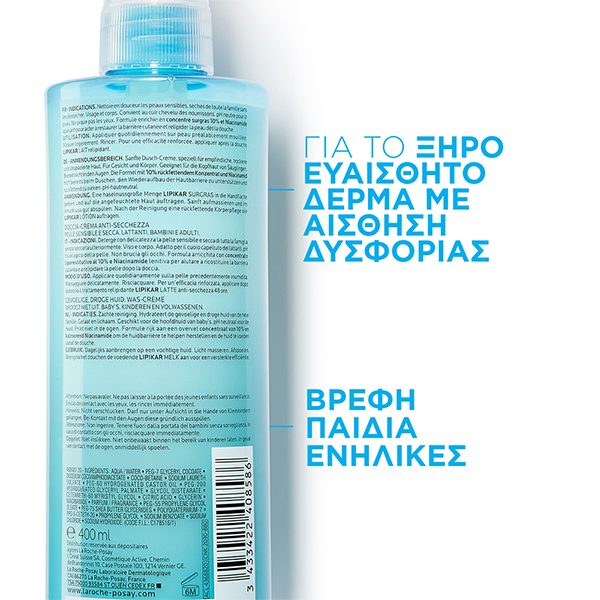 ΙΔΙΟΤΗΤΕΣ: Απαλό καθαριστικό χωρίς σαπούνι και χωρίς paraben, ειδικά σχεδιασμένο για το ξηρό δέρμα χωρίς άνεση. Κατάλληλο για παιδιά και ενήλικες. Απαλό καθαριστικό χωρίς σαπούνι και χωρίς paraben, ειδικά σχεδιασμένο για τη ξηρή επιδερμίδα που έχει χάσει την άνεσή της. Σύνθεση εμπλουτισμένη με λιπίδια και Νιασιναμίδη για την αποκατάσταση του επιδερμιδικού φραγμού και την επαναφορά των λιπιδίων κατά το ντους.