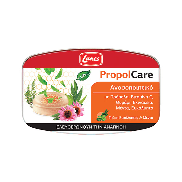 Οι καραμέλες PropolCare σε γεύση ευκάλυπτος & μέντα συνδυάζουν πρόπολη, θυμάρι, εχινάκεια και βιταμίνη C. Η πρόπολη θεωρείται ως «φυσικό αντιβιοτικό» και συμβάλλει στην αντιμετώπιση των συμπτωμάτων του κοινού κρυολογήματος χάρη στις αντισηπτικές και αντιοξειδωτικές ιδιότητες. Το θυμάρι ανήκει στα χαλαρωτικά αποχρεμπτικά βότανα. Η εχινάκεια είναι ένα βότανο με ευεργετικές ιδιότητες καθώς θωρακίζει το ανοσοποιητικό σύστημα, ενώ παράλληλα βοηθά στην ενδυνάμωση της άμυνας του οργανισμού, συμβάλλοντας στην πρόληψη του κρυολογήματος. Η βιταμίνη C συμβάλλει στη φυσιολογική λειτουργία του ανοσοποιητικού καθώς και στην προστασία των κυττάρων από το οξειδωτικό στρες. Παράλληλα, η βιταμίνη C συμβάλλει στη φυσιολογική λειτουργία των μεταβολικών διεργασιών που αποσκοπούν στην παραγωγή ενέργειας, στη φυσιολογική ψυχολογική λειτουργία και στη μείωση της κούρασης.
