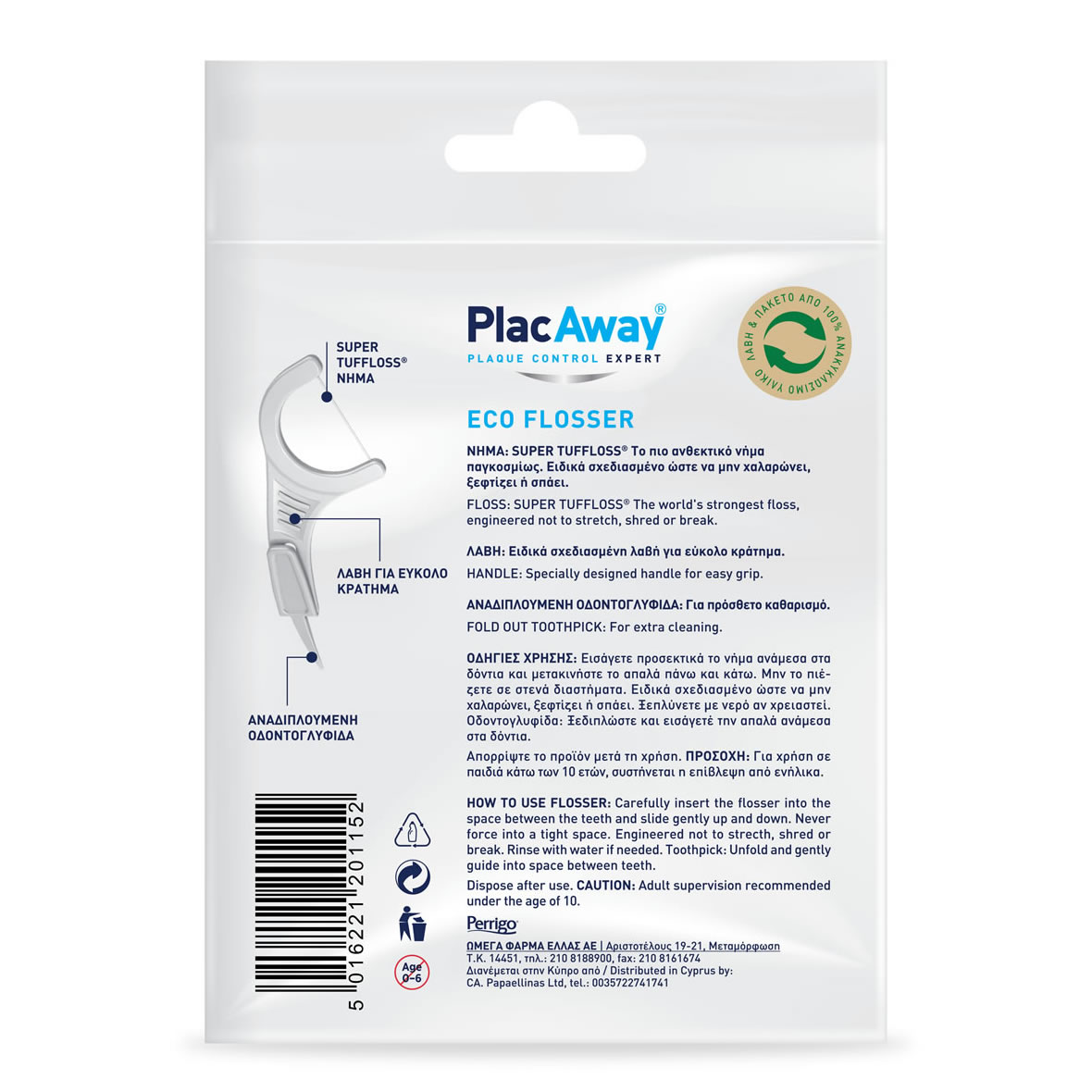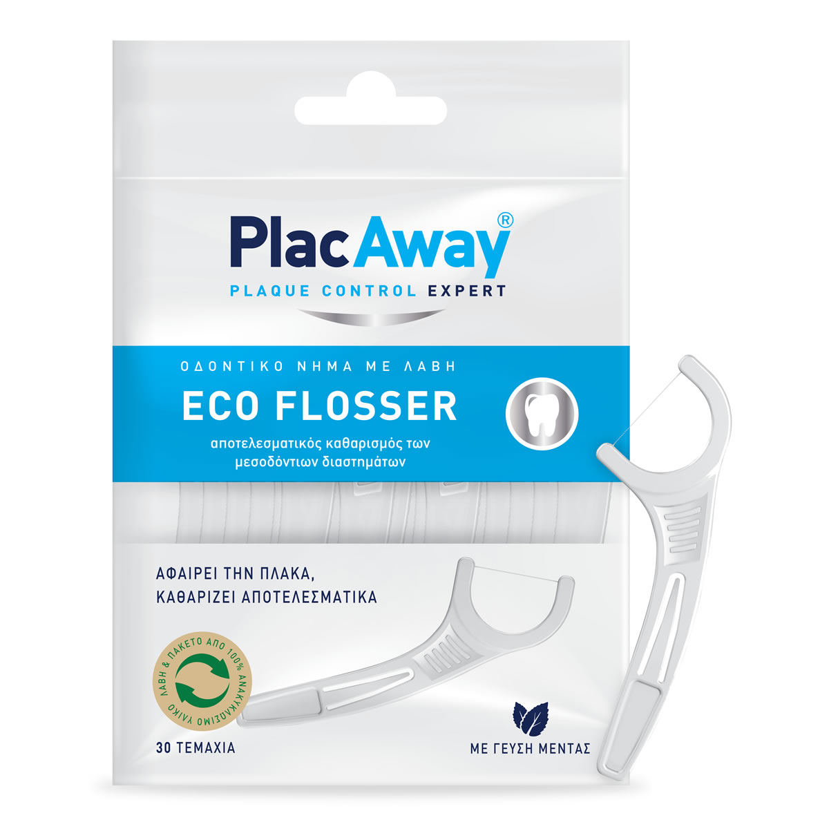 Νέο Plac Away ECO FLOSSER οδοντικό νήμα με λαβή για αποτελεσματικό καθαρισμό των μεσοδόντιων διαστημάτων. Αφαιρεί την πλάκα, καθαρίζει αποτελεσματικά.