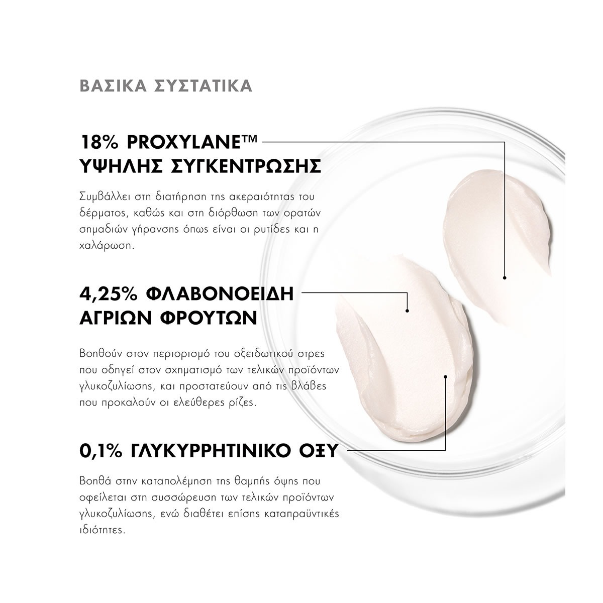 Αντιγηραντική κρέμα προσώπου, με υψηλή συγκέντρωση σε δραστικά συστατικά, που βοηθά στη μείωση των ρυτίδων, της απώλειας σφριγηλότητας και της θαμπής όψης που σχετίζονται με τη φυσική διαδικασία γήρανσης, αλλά και με τη δημιουργία τελικών προϊόντων προηγμένης γλυκοζυλίωσης (A.G.E.), που προκύπτει όταν μόρια σακχάρου προσκολλώνται στις ίνες κολλαγόνου και ελαστίνης, αποδυναμώνοντας τη δομή του δέρματος. Σύνθεση με υψηλή περιεκτικότητα σε Proxylane που βοηθά στη βελτίωση της υφής, της σφριγηλότητας και της ελαστικότητας της επιδερμίδας. Ενισχυμένη με φλαβονοειδή και γλυκυρρητινικό οξύ, βελτιώνει τη λάμψη και προστατεύει ενάντια στην επιδείνωση των σημαδιών γήρανσης.
