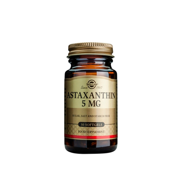 Φυσικό καροτινοειδές από το άλγος Ηaematococcus Pluvialis με αντιοξειδωτικά. Η ασταξανθίνη παρουσιάζει πολύ πιο ισχυρή αντιοξειδωτική δράση από εκείνης της βιταμίνης Ε και της βήτα-καροτίνης. Λόγω της μοριακής της δομής, μπορεί να δρα και σε λιποειδές και σε υδατώδες περιβάλλον. Επιπρόσθετα, έχει την ικανότητα να ανακυκλώνει άλλα αντιοξειδωτικά, όπως τις βιταμίνες C και Ε καθώς και την λουτεΐνη, βήτα καροτίνη και γλουταθειόνη. Έρευνες έχουν δείξει ότι είναι ιδιαίτερα χρήσιμη ουσία για τον ανθρώπινο οργανισμό στην προστασία των οφθαλμών από εκφυλιστικές αλλοιώσεις. Επιπλέον, μπορεί να βοηθήσει την καρδιαγγειακή υγεία και να προλάβει διαταραχές του νευρικού συστήματος. Ακόμη μελέτες δείχνουν ότι μπορεί να βελτιώσει την κυτταρική επικοινωνία και ακεραιότητα, και να προστατεύσει το δέρμα από την υπεριώδη ακτινοβολία. H Astaxanthin 5mg της Solgar παρέχει ισχυρή αντιοξειδωτική δράση.
