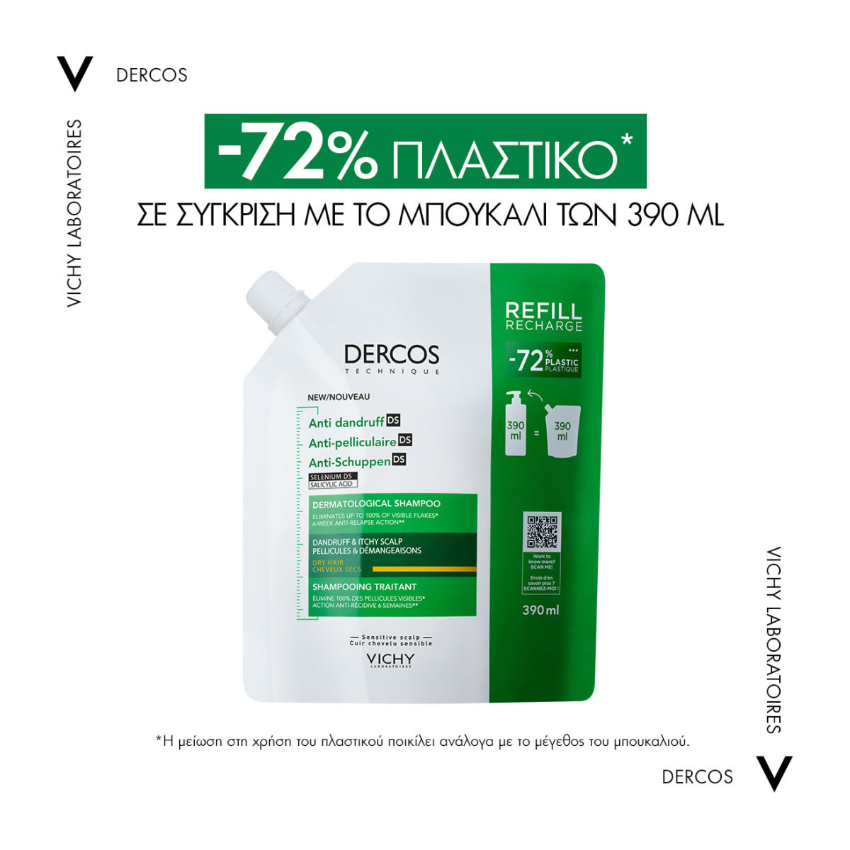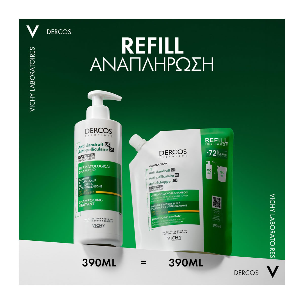 VICHY DERCOS Anti-Dandruff DS Σαμπουάν Κατά της Ξηροδερμίας, της Πιτυρίδας και του Κνησμού για Ξηρά Μαλλιά. Οικολογική Συσκευασία Refill 390ml