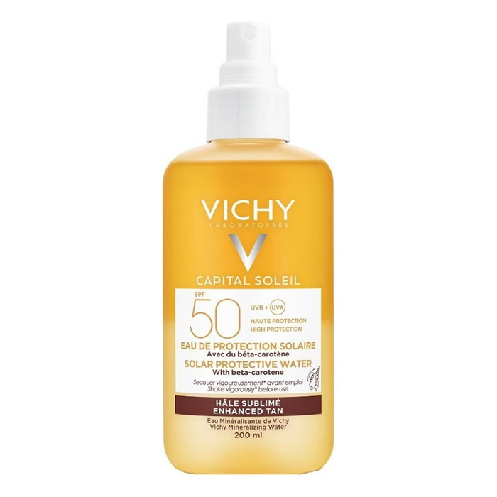 Αντηλιακό Νερό Υψηλής Προστασίας από τον ήλιο για λαμπερό μαύρισμα με βήτα καροτίνη και Ιαματικό Mεταλλικό Νερό της Vichy. Ιδανικό για Πρόσωπο και Σώμα.