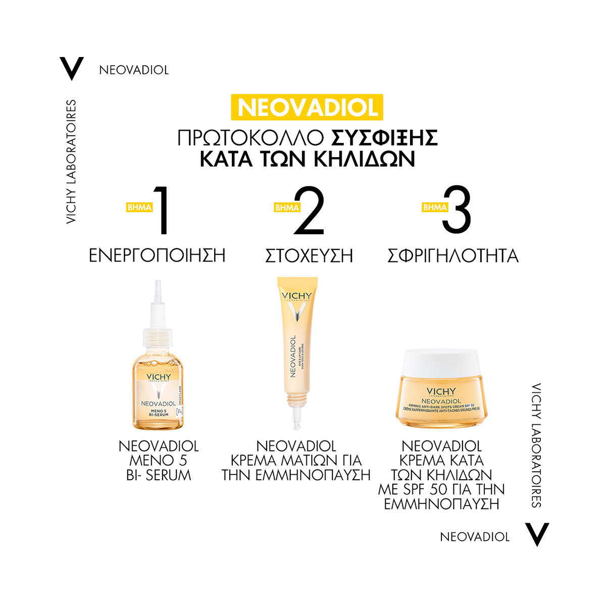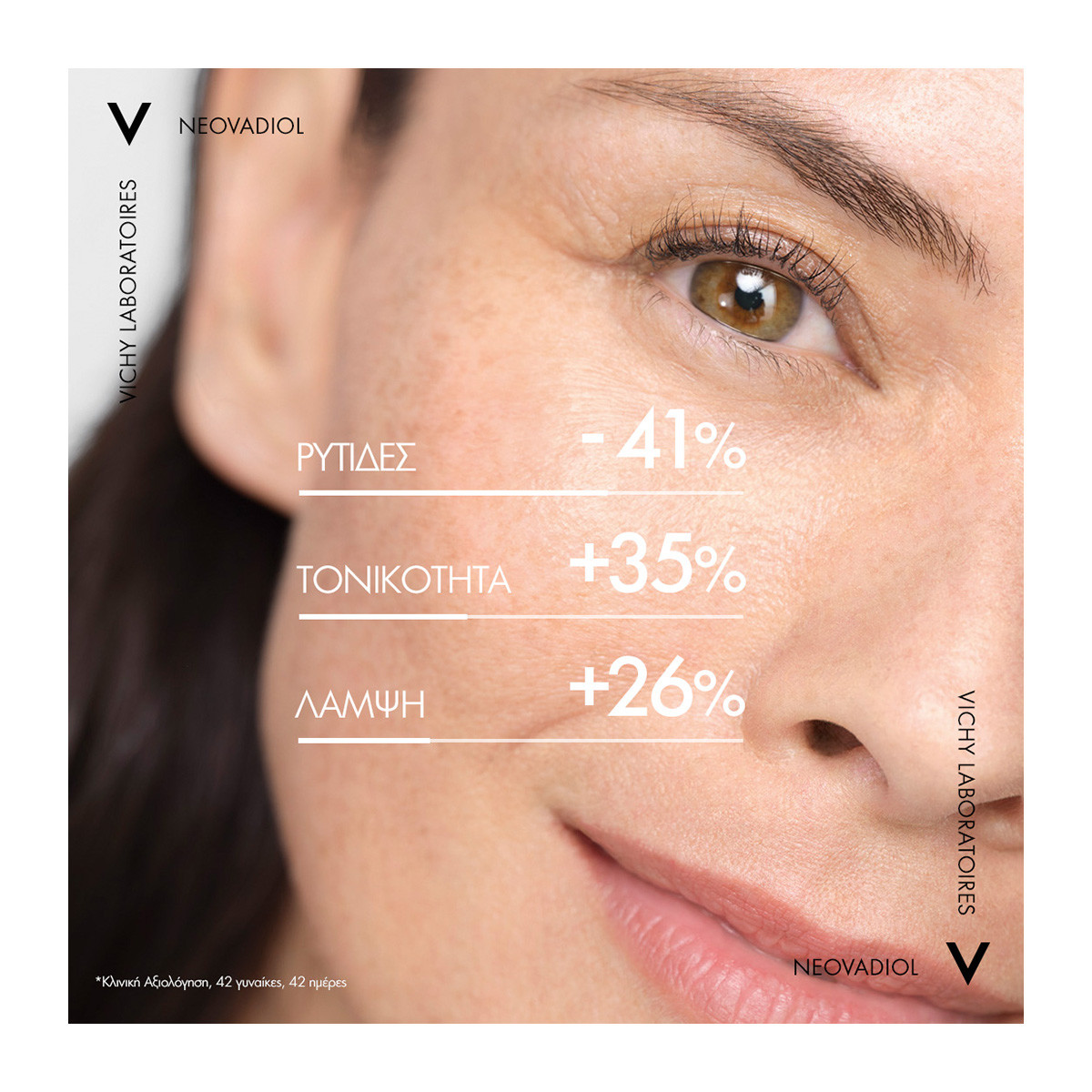 Η Neovadiol Κρέμα Ημέρας Σύσφιξης & Μείωσης Κηλίδων με δείκτη προστασίας SPF50 , διορθώνει τις ρυτίδες, μειώνει τις κηλίδες και βελτιώνει την ελαστικότητα, καλύπτοντας όλες τις ανάγκες της επιδερμίδας την περίοδο της μετεμμηνόπαυσης. Την περίοδο της μετεμμηνόπαυσης, οι ορμονικές αλλαγές που βιώνουμε επιταχύνουν τη γήρανση του δέρματος. Η επιδερμίδα χάνει την πυκνότητα της και γίνεται ορατά πιο θαμπή. Το περίγραμμα αλλοιώνεται. Επειδή η αποτελεσματικότητα είναι προτεραιότητά μας στη Vichy, οι συνθέσεις έχουν κλινικά αξιολογηθεί από δερματολόγους σε εμμηνοπαυσιακές γυναίκες με ευαίσθητο δέρμα.