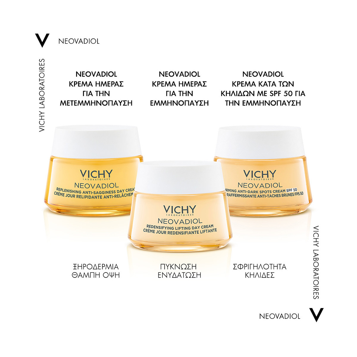 Vichy Neovadiol Κρέμα Ημέρας Σύσφιξης & Μείωσης Κηλίδων με δείκτη προστασίας SPF50 για την περίοδο της μετεμμηνόπαυσης. Διορθώνει τις ρυτίδες, μειώνει τις κηλίδες και βελτιώνει την ελαστικότητα.